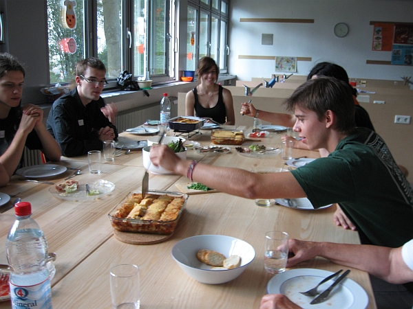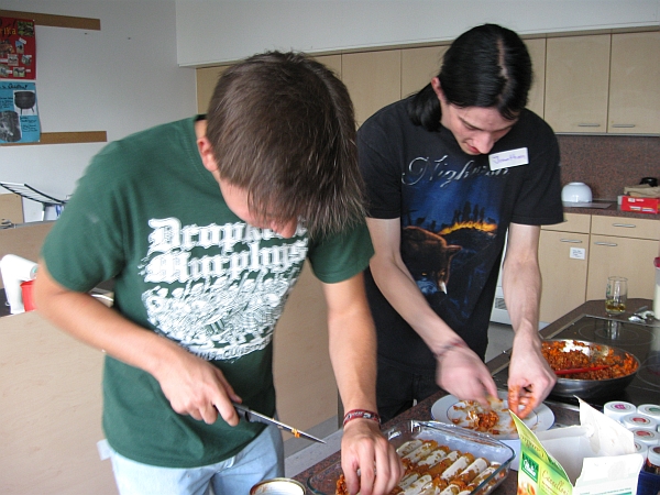 Hirschberg-Leutershausen (aste). Bisher hatte die AWO-Leutershausen für ihre Jugend immer LAN-Partys veranstaltet. Jetzt fand Vorsitzende Ingrid Scholz, man müsste auch mal etwas anderes machen und schlug einen gemeinsamen Kochabend vor. "Es war erstmal Stille", lachte sie. Doch dann fanden die jungen Leute den Gedanken an so ein selbst gekochtes Drei-Gänge-Menü gar nicht so übel und verabredeten sich am Donnerstagabend kurz entschlossen in der Küche der Karl-Drais-Schule - "einfach wegen dem Hunger und dem Spaß". Schon träumten sie von Gänsebraten und Pfefferminzsorbet mit Schokoladensoße. Scholz musste die übermütigen Koch-Einsteiger bremsen auf ein "einfaches" Menü aus Mortadella- und Käse-Carpaccio, Cannelloni, wahlweise mit Fleisch- oder vegetarischer Quarkfüllung, und Tiramisu oder Herrencreme. Für die meisten der zehn 16 bis 19-Jährigen war dies das erste selbständige Kocherlebnis. Scholz hatte alles eingekauft und stand gemeinsam mit Mama Eleonore Kabbe als Beraterin zur Verfügung, doch ansonsten mussten die Jugendlichen vom Zubereiten bis zum Spülen komplett alleine ran. Stirnrunzelnd überflog Jonathan das Rezept. "Ich bin sehr gut mit der Mikrowelle", war der auf Maultaschen mit Ketchup-Sahne-Soße spezialisierte Tütenkoch gespannt auf die ganz neue Erfahrung, die ihm nun bevorstand. "Ich bin zuversichtlich, dass das klappt", machte ihm sein Freund Dominic Mut. Der hatte schon öfter mal mit seinem Vater gekocht und erfreute sich nun an den "Zwei-Meter-Möhren". Stand schließlich so auf der Zutatenliste: "zwei m-große Karotten". Liebevoll zerhackten die beiden daraufhin Zwiebeln, die beiden mittelgroßen Möhren und Tomaten und stellten mit verstohlenem Blick auf Jans und Patricks grobgehackte Exemplare fest, dass ihre viel schöner waren. Unerschrocken machte sich Jonathan daraufhin ans Würzen seiner köstlich blubbernden Hackfleischpfanne. "Ich mach das nach Intuition", verriet er geheimnisvoll und kippte beherzt ein paar kräftige Streuer Pizzagewürz, rosenscharfe Paprika und Oregano dazu. "Ob das was bringt ?", schüttete er auch noch ordentlich Basilikum rein. "Wenns nix ist, tun wir halt dann Sahne rein", erinnerte er sich dunkel an einen der Koch-Rettungstipps seiner Oma. "Und ? Deine Meinung ?" reichte er den Löffel mit einer Geschmacksprobe an Dominic. "Schmeckt nach gar nix", fand der, es müsste irgendwie noch mehr rein. "Muss ja schließlich gut durch sein", betrachtete Jan an der Nebenplatte fasziniert das qualmende Fett in seiner Pfanne und bedeckte das Ganze erstmal mit heftig aufbrutzelndem Hackfleisch. Höchste Konzentration war angesagt bei Julia und Johanna, die gerade die Waffelbiskuits für den Nachtisch in Kaffee tränkten. Die beiden Damen hatten sich die süße Nachspeise ausgesucht, "weil das idiotensicher ist". Außerdem kann man da so lecker naschen. "Das Einzige, was das hier nicht ist - kalorienarm", lachte Scholz. Die erfreute sich, wie Patrick und Benita mit Löffel und Messer die Füllung in ihre Nudelröllchen quetschten. Den Trick, wie das leichter geht, würde sie später verraten. Zweifellos war dieses Koch-Event - und vor allem das anschließende Essen - für alle ein Riesenspaß. Von dem köstlichen Duft angezogen wurde auch SPD-Landtagsabgeordneter Gerhard Kleinböck, der in Ladenburg vier Jahre lang selbst einen Partyservice führte. Für den Winter versprach er den Jugendlichen, mit ihnen einmal sein persönliches Lieblingsgericht "Tafelspitz mit Sahne-Meerrettich" zu kochen. Bericht aus der Rhein-Neckar-Zeitung vom 16.07.2011 |