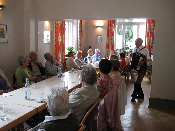 Dieses Jahr haben die AWO – Verantwortlichen keinen Pakt mit dem Wettergott abgeschlossen: Während im letzten Jahr den Besuchern bei hochsommerlichen Temperaturen die Schweißperlen auf der Stirn standen, wehte diesmal gleich nach dem Mittagessen im schön dekorierten Garten der Alten Villa ein kalter Wind herüber. Da zogen es die Verantwortlichen um die AWO-Vorstandsspitze mit Ingrid Scholz und Thea Kolb vor, die geschützten Räume der Villa aufzusuchen. Doch zuerst ließen es sich die Gäste einmal schmecken. Schnitzel oder Wiener Würstchen wurden gereicht, dazu gab es ein Salatbüfett: Eine gute Grundlage also für den weiteren Nachmittag. Als dann noch Brigitte Berninger mit einem Eis zum Nachtisch überraschte, war die Freude groß. Lediglich der Besuch war für die Verantwortlichen etwas enttäuschend. „Viele Senioren gehen einfach nicht zu diesen Veranstaltungen, dabei gibt es gerade hier genügend Abwechslung vom Alltag“, meinte Ingrid Scholz. Nun, hätten es die Senioren geahnt, was der „Singende Kellermeister“ Hans Todt aus Weinheim mit der Lederschürze alles auf Lager hatte: Sie wären bestimmt erschienen. Todt spulte sein ganzes Repertoire herunter , sang mit den Senioren Volkslieder, Alte Schlager und natürlich Schunkellieder. Plötzlich war „Stimmung im Saal“ und alles war verbunden mit vielen Erinnerungen und einem kräftigen Schuss Humor. Hans Todt singt nicht nur, sondern er ist auch ein guter Erzähler. Von Erlebnissen aus der Jugendzeit, über die Hochzeit ins spätere Leben und bis hin zur Goldenen Hochzeit. „Sie sollen das Lachen nicht verlernen. Hier ist die AWO ein ganz wichtiger Stützpfeiler und die Senioren sollten solche Nachmittage unbedingt annehmen“ , lautete die Bitte des rüstigen Unterhalters. Zwischendurch wünschten sich die Besucher bei Kaffee und Kuchen einige Lieder und allen gefiel dieser unterhaltsame Nachmittag, weil Hans Todt genau den richtigen Ton traf und lang anhaltender Applaus am Schluss war der verdiente Lohn für den Unterhalter. Bericht aus der Rhein-Neckar-Zeitung vom 01.08.2011 |